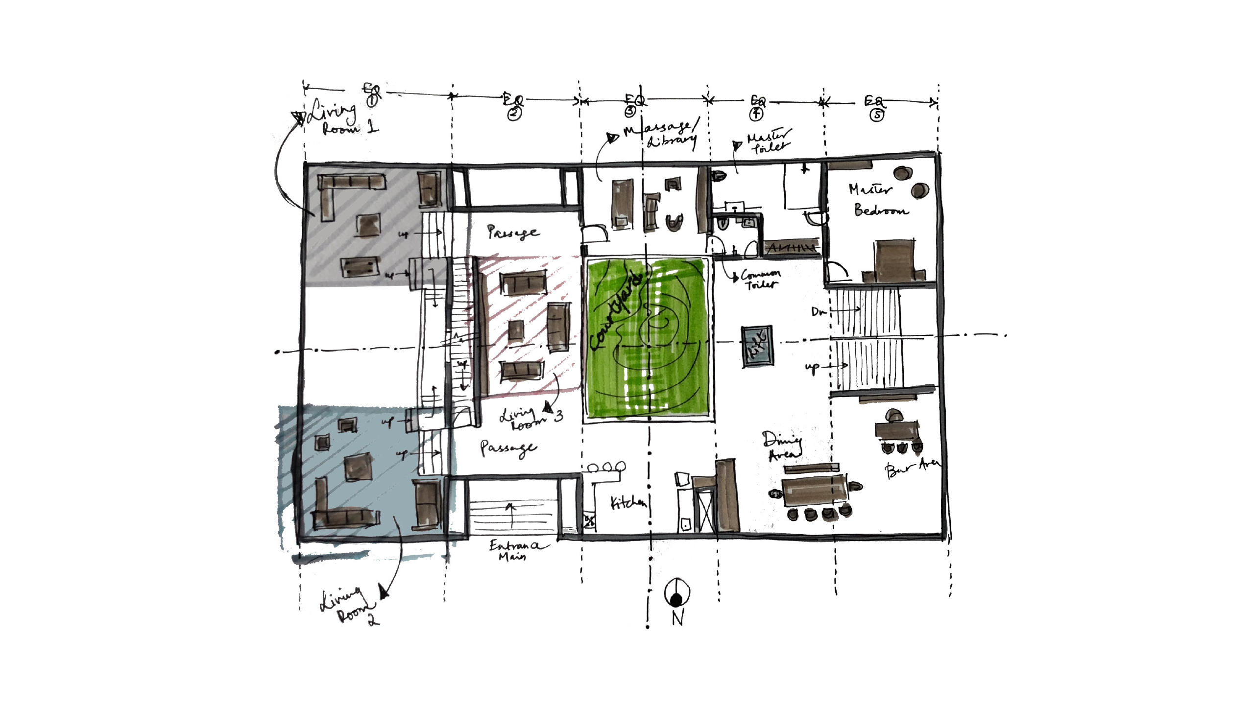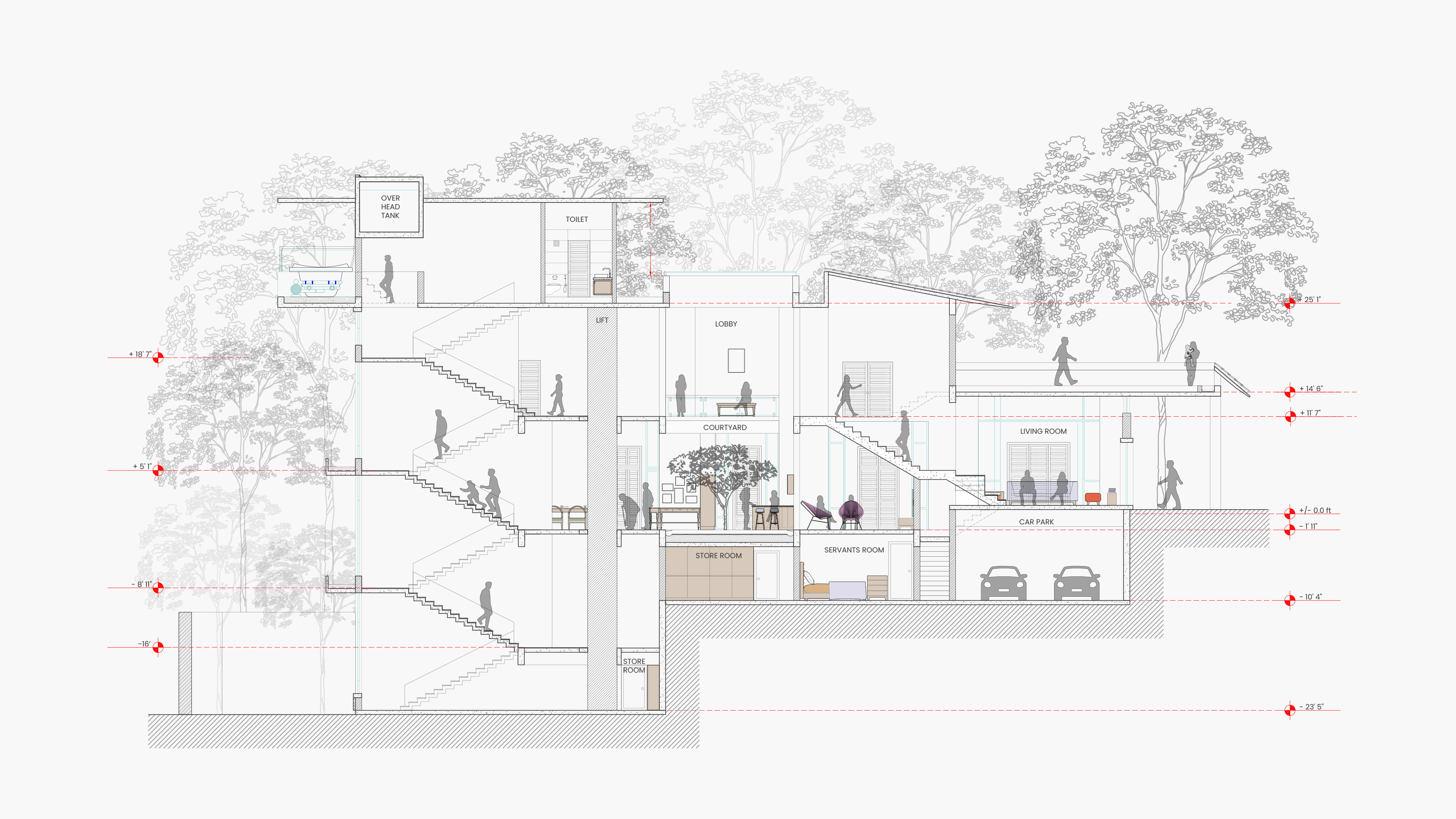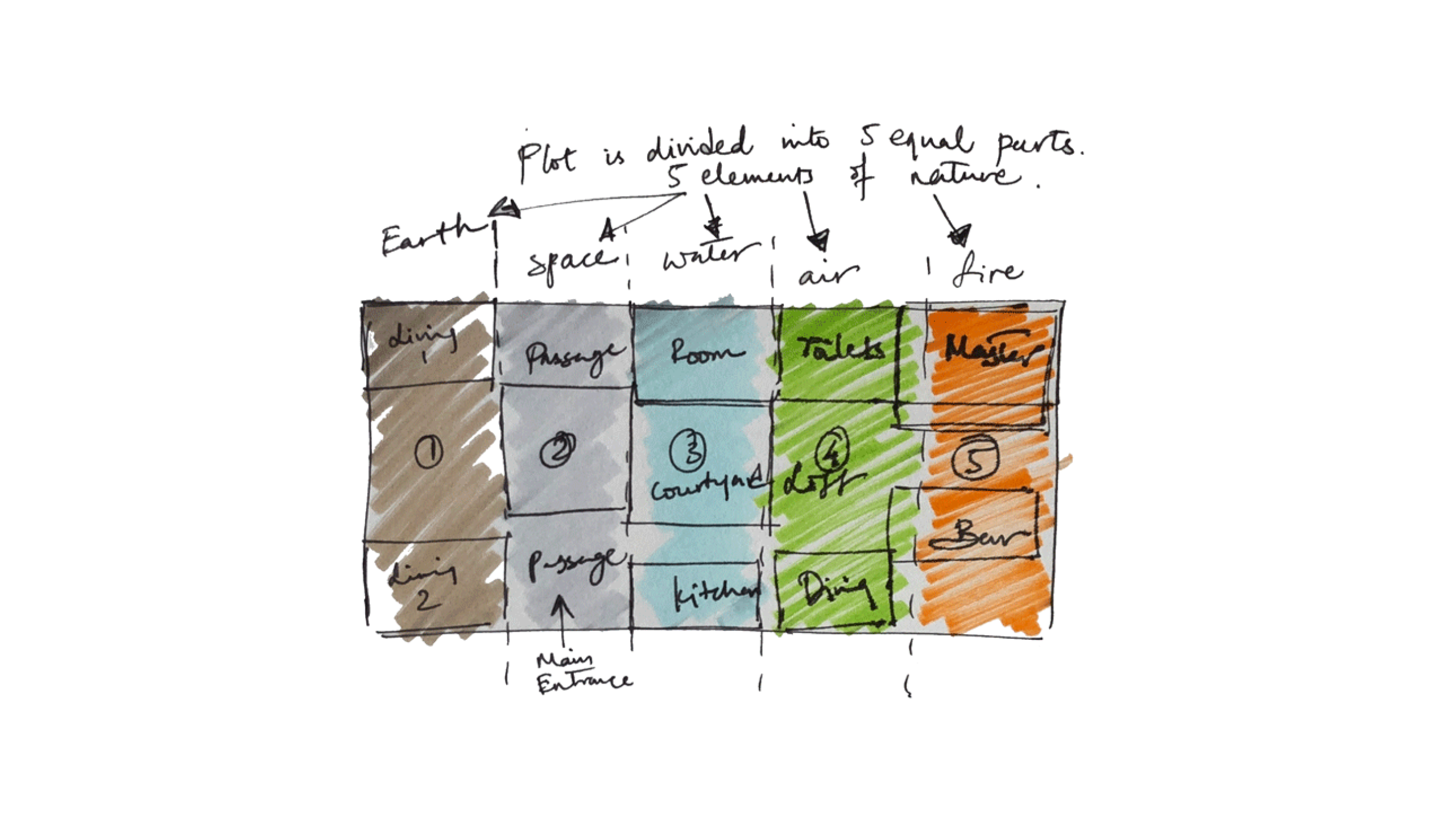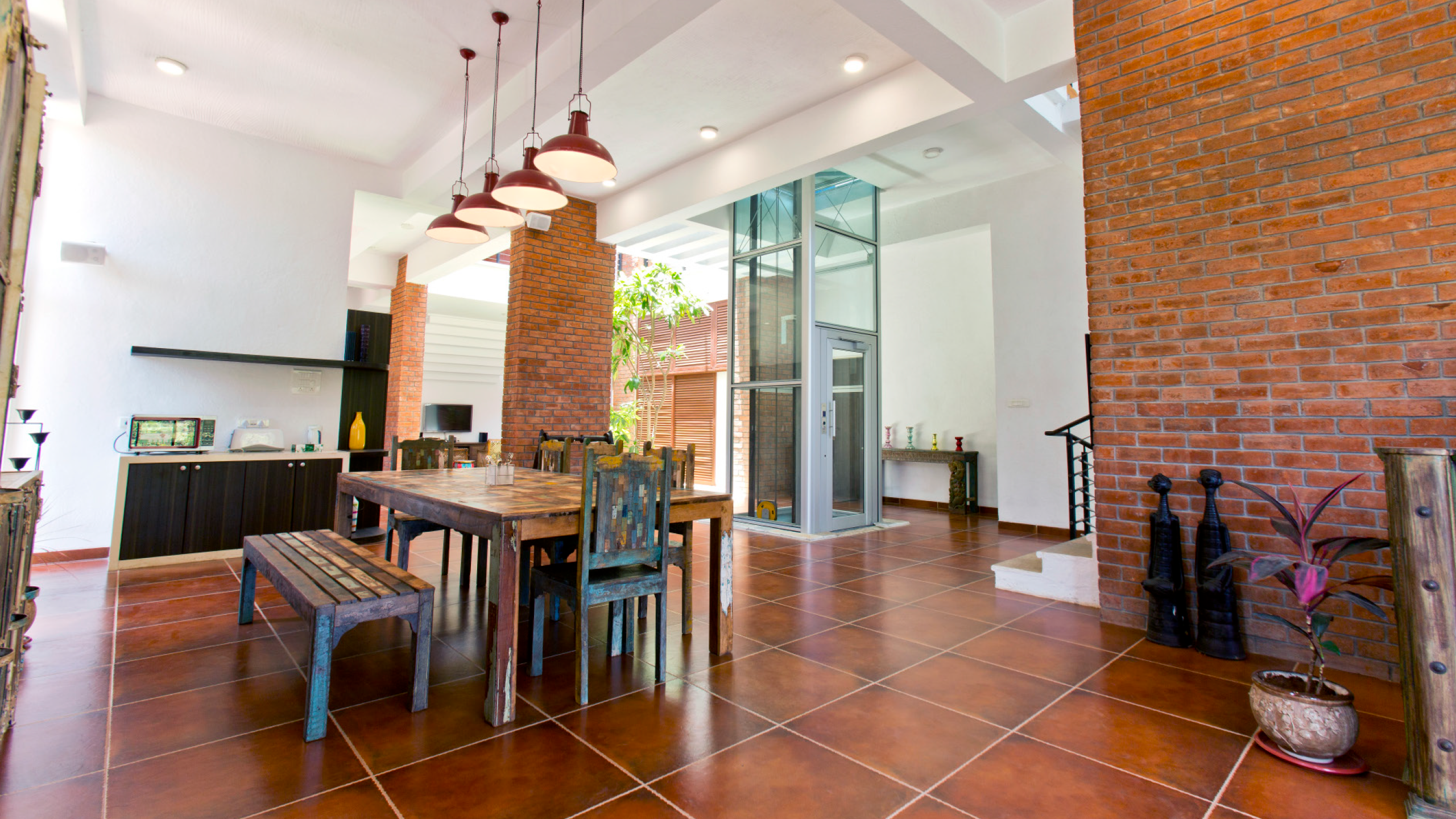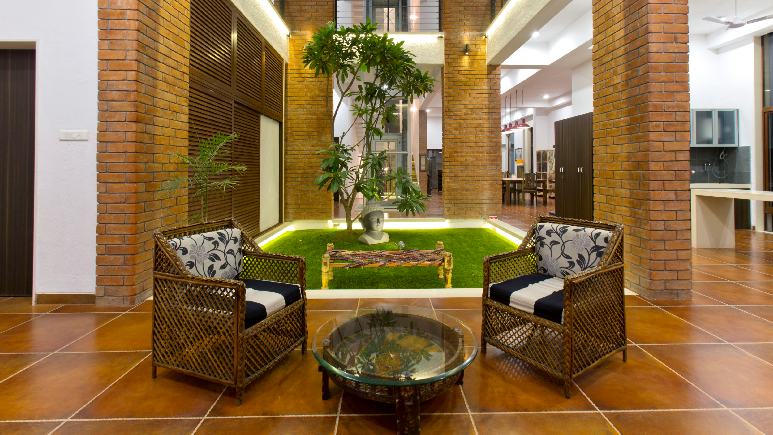 The material palette was carefully curated to reflect the natural elements and traditional roots of South Indian architecture. Brick and Terracotta were used to express Earth and warmth. Glass introduced transparency and represented Space. Bamboo provided a sustainable and tactile element, referencing Air and organic fluidity. Metal added structure and fire-like resilience. These materials, in their raw and honest forms, helped establish a dialogue between tradition and modernity, allowing the architecture to feel both rooted and refined. The palette supported the spiritual and cultural narrative of the home while also enhancing its modern livability.